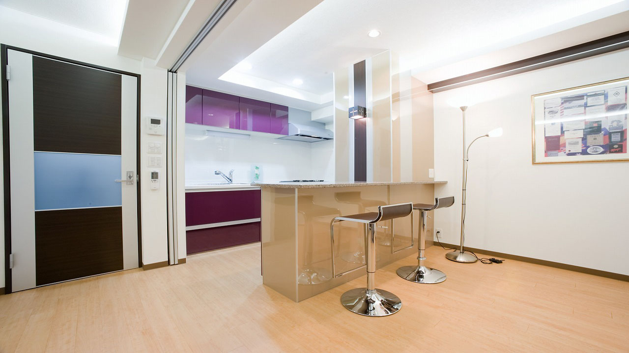 コントラストのあるスタイリッシュなデザインで開放的なキッチンがある分譲賃貸のお部屋