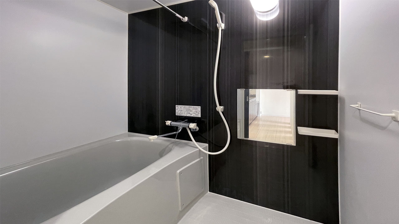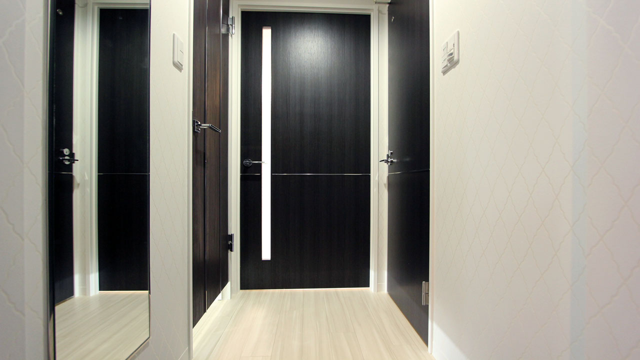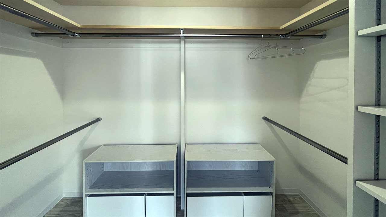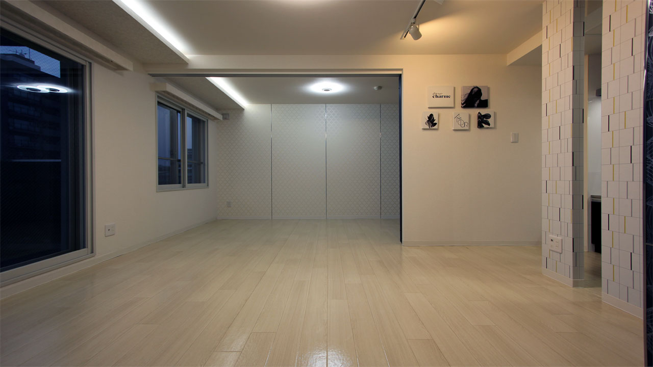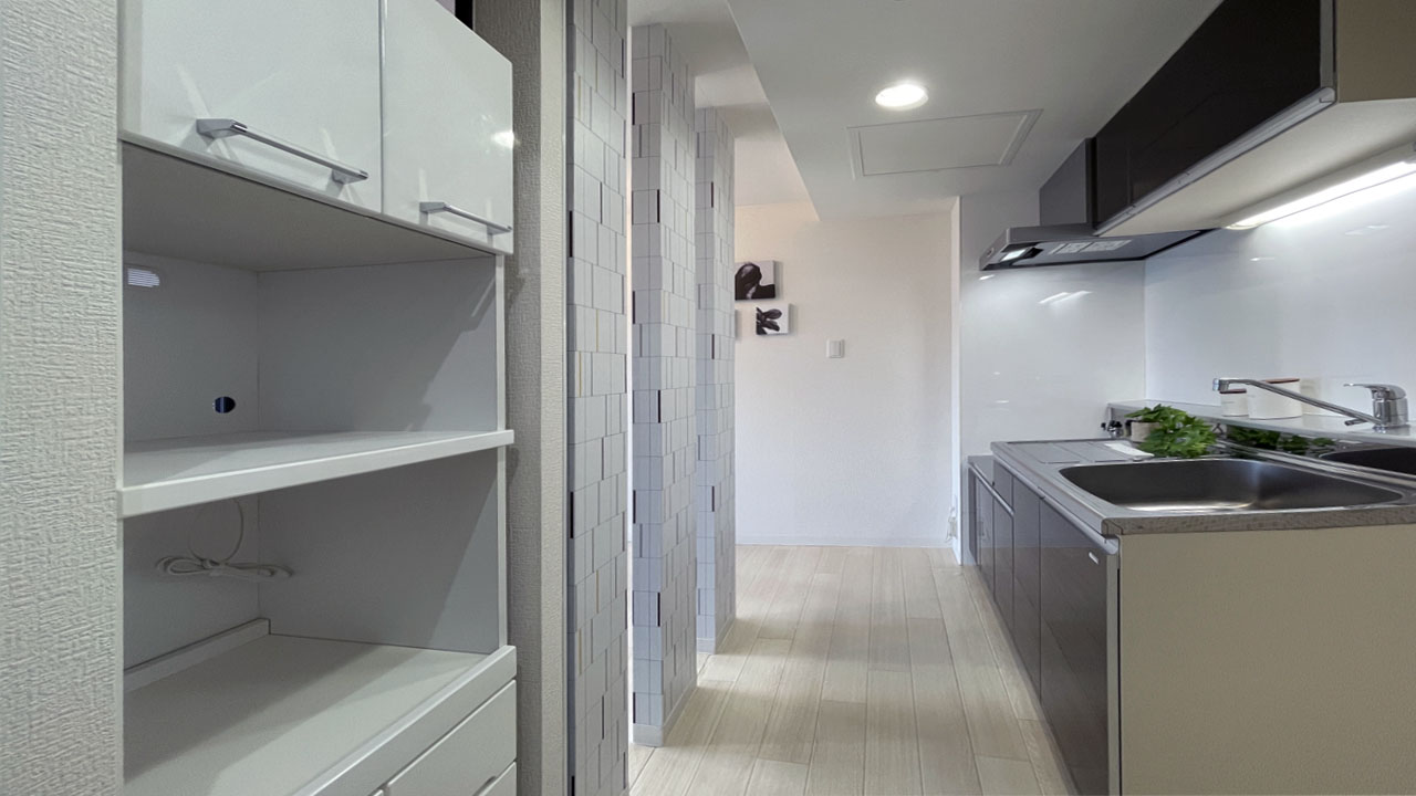 リビングにはデザイン柱を設けてスポットライトと間接照明でシックな空間へ。キッチンには食器棚を完備し、エントランスにはシューズクローゼット、寝室には大型ウォークインクローゼットと収納豊富なお部屋